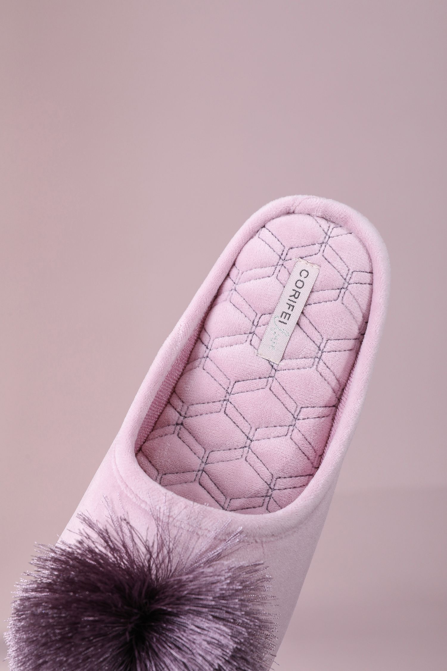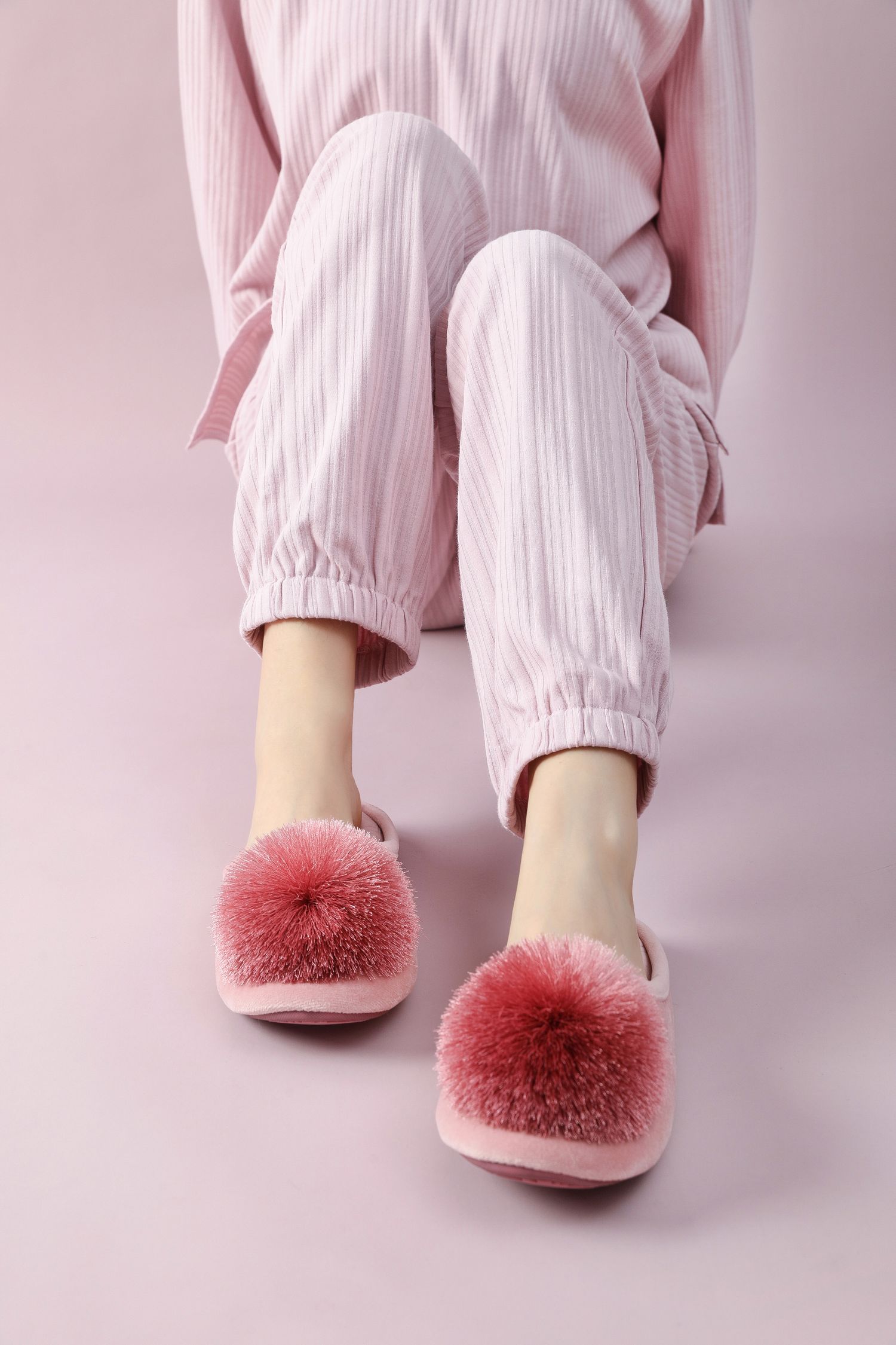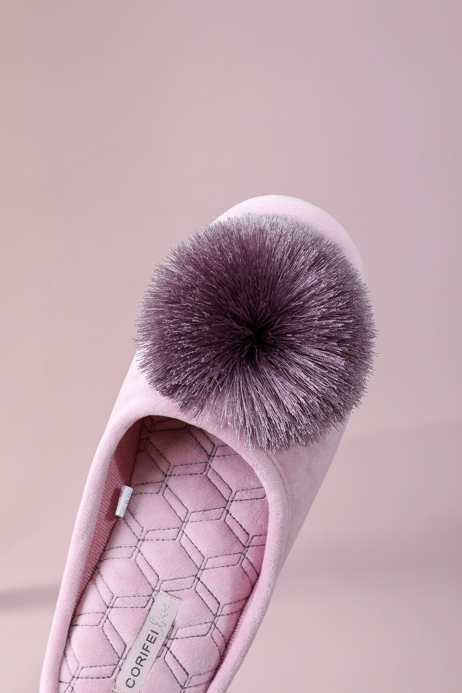 Bailarina de interior de tela de felpa suave para dama con pompones de hilo de seda