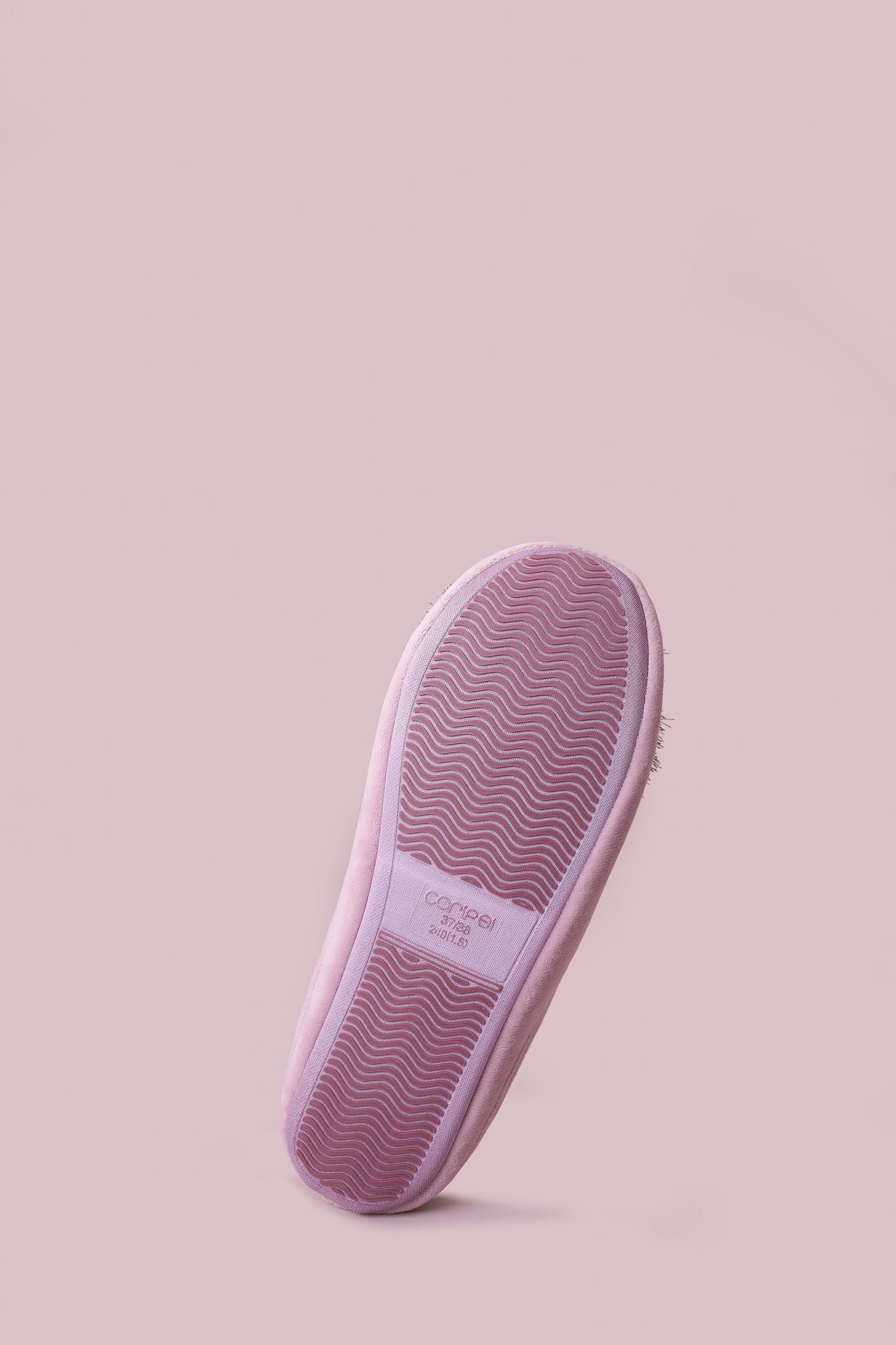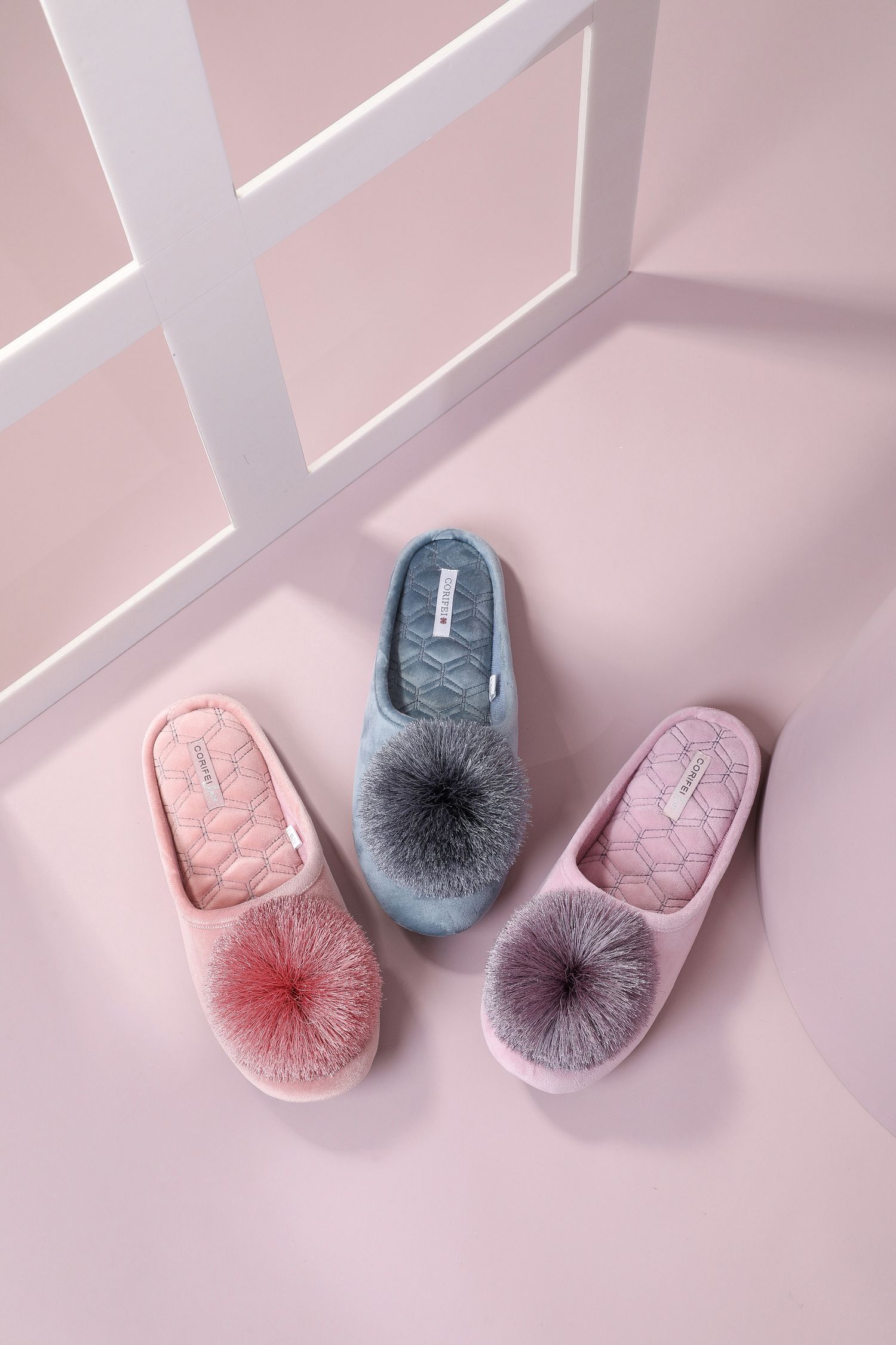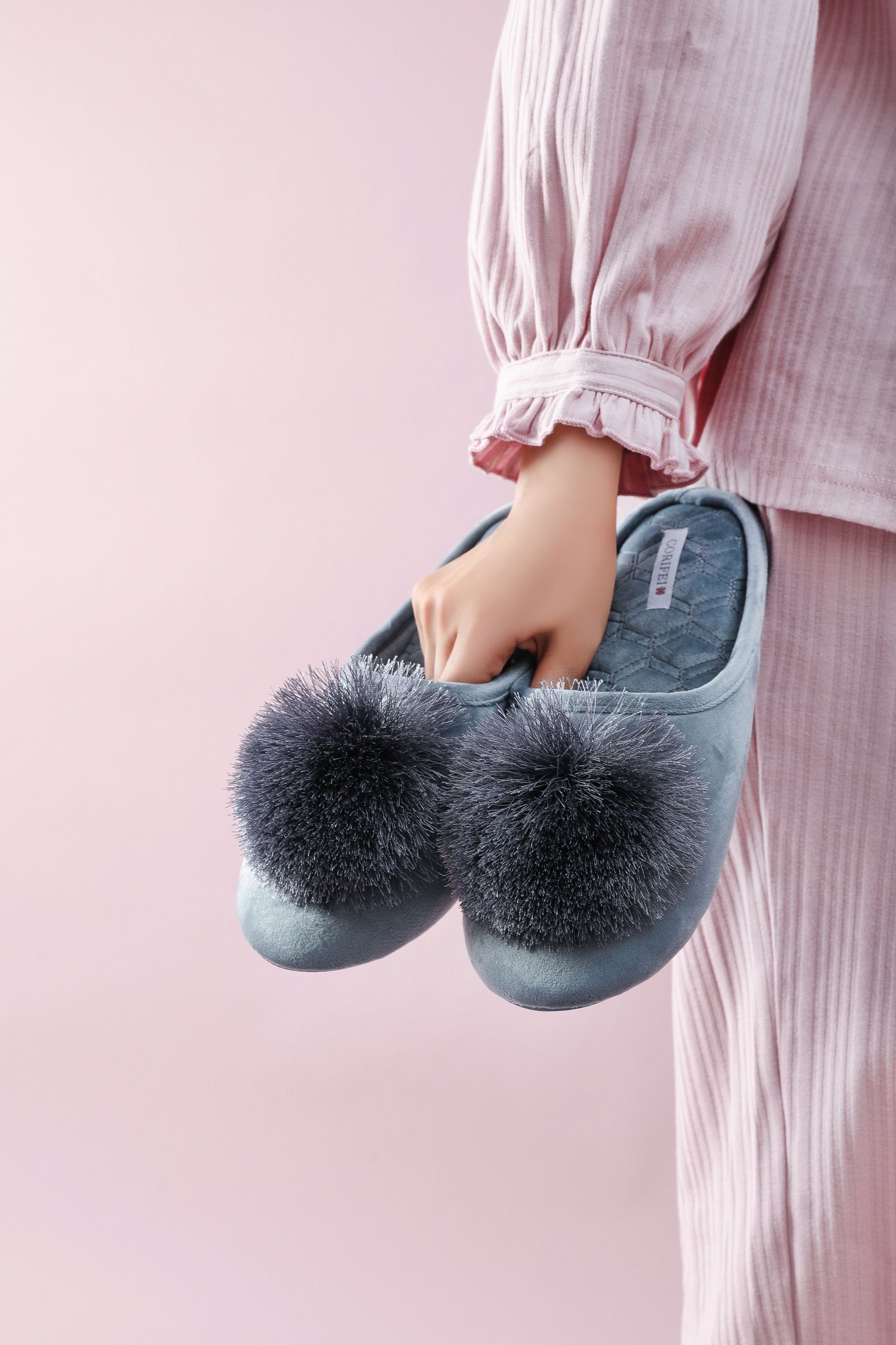 Bailarina de interior de tela de felpa suave para dama con pompones de hilo de seda